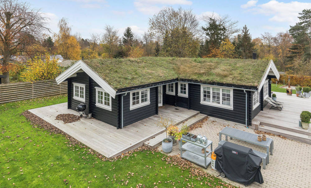 Дома с черными фасадами очень популярны в скандинавских странах. В условиях дефицита солнца, этот цвет хорошо поглощает тепло. А еще черный фасад созвучен тренду на использование обожженной древесины. На примере этого частного дома, построенного десять лет назад, можно увидеть, как современно и ново выглядит коттедж с черным фасадом. Изначально владельцы планировали отдыхать здесь летом, но дом оказался настолько комфортным и теплым, что теперь они периодически приезжают сюда в течение всего года (в отпуска и на уик-энды). Постройка посажена на небольшую возвышенность. Оригинальный внешний вид экстерьеру придает зеленая кровля — она не только радует глаз, но и отлично изолирует тепло и звук. На 104 м² спланированы гостиная, кухня-столовая, три спальни и ванная комната. В целом, несмотря на средний метраж, дом получился достаточно просторным — и все благодаря высоким потолкам, большим окнам и облегченным светлым оттенкам в оформлении интерьера. В плане коттедж имеет Г-образную форму и с