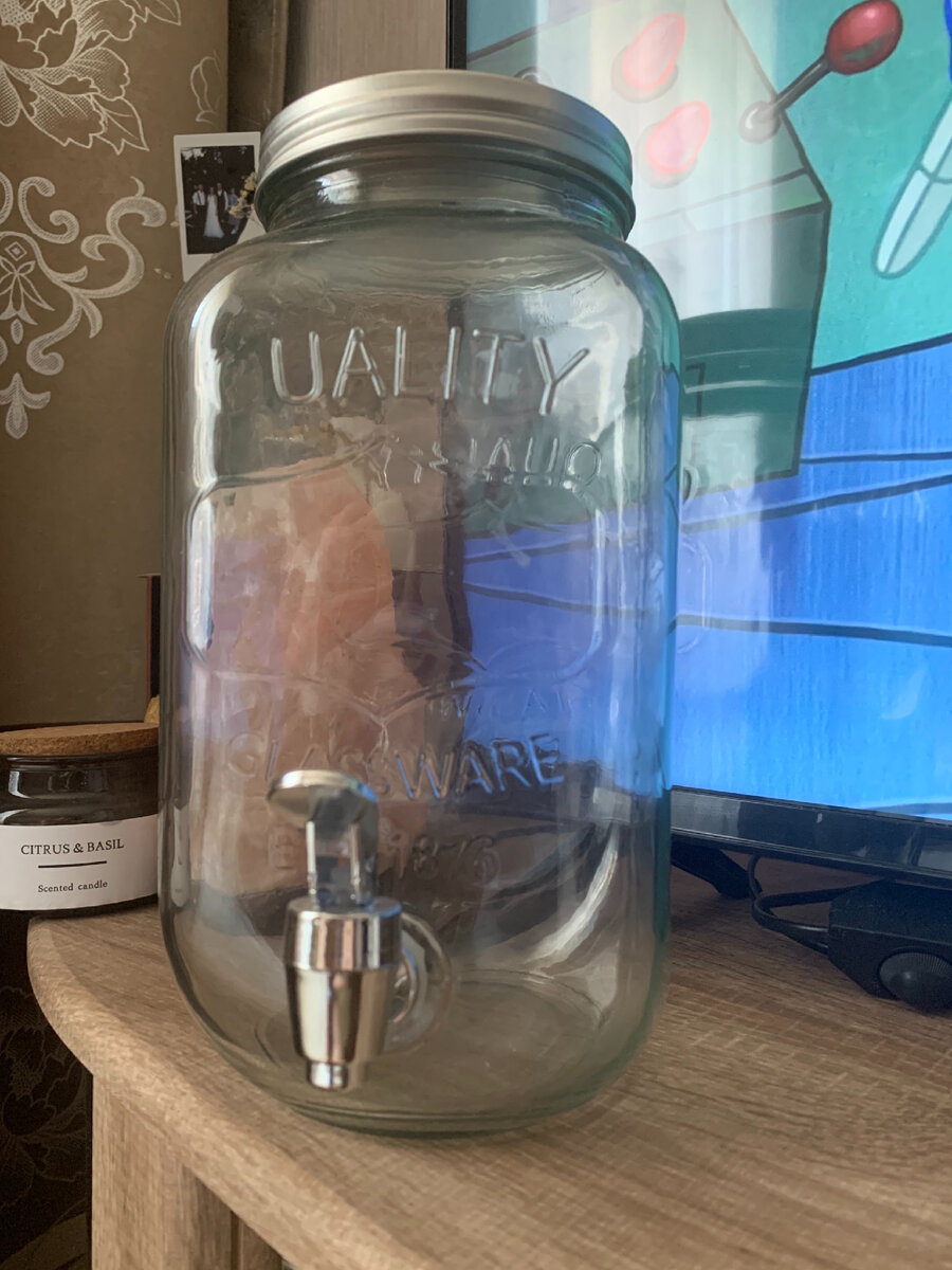 Расскажу про популярную банку с краном из Fix price. Банка с краном – стильное и удобное решение для подачи домашних лимонадов, морсов, соков и других прохладительных напитков! Станет оригинальным элементом в сервировке Вашего стола для пикника или летней вечеринки. Банка дополнена закручивающейся крышкой. Объём: 3 литра. В ассортименте представлено 2 дизайна. С банкой идёт в комплекте кранчик и есть для него отверстие, и вас не затруднит установит кранчик в банку. По моему опыту при использовании не надо до конца закручивать крышку, для того, чтобы воздух заходил в банку и там не создавалось отрицательное давление. По простому, чтобы напиток хорошо лился.