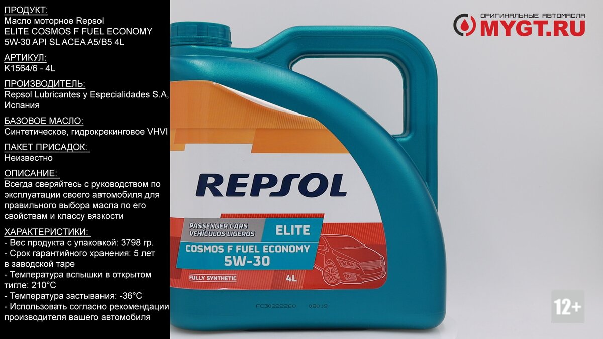 Продукт: Масло моторное Repsol ELITE COSMOS F FUEL ECONOMY 5W-30 API SL ACEA A5/B5 4L Наш телефон: 8-800-550-57-22 ПН-ПТ 9.00-17.00 (МСК+4) Артикул: K1564/6 - 4L Производитель: Repsol Lubricantes y Especialidades S.A, Испания Базовое масло: Синтетическое, гидрокрекинговое VHVI. Пакет присадок: Неизвестно Ссылка для покупки: https://mygt.ru/oil/ Описание: Синтетическое моторное масло REPSOL ELITE COSMOS F FUEL ECONOMY 5W30 для бензиновых и дизельных двигателей. Разработано специально для транспортных средств производимых компанией FORD, а так же европейских производителей, где необходим уровень качества ACEA A5/B5. Позволяет существенно снизить расход топлива и снизить выбросы CO2. Свойства Тесты, проведенные согласно условиям стандарта метода М111FE показывают, что использование данного масла позволяет снизить расход топлива на 3% в сравнении с другими маслами. Отвечает требованиям согласно спецификации FORD WSS-M2C193C. Применяется при заявленном уровне качества FOR