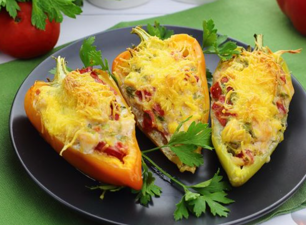 Лодочки из болгарского перца, фаршированные куриным филе, помидорами, луком - простое и в то же время нарядное блюдо