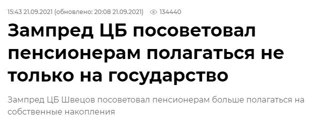 Бурную реакцию в сети вызвали высказывания первого зампредседателя ЦБ РФ Сергея Швецова, который посоветовал пенсионерам полагаться не только на государство, а и на собственные накопления. Выступая на заседании комитета Совета Федерации по бюджету и финансовым рынкам, госп. Швецов заявил, что гражданин должен выходить на пенсию с "хорошим пенсионным пакетом", который должен быть сформирован самим гражданином, государство должно помогать ему именно в этом. Помогать пенсионерам - уже поздно, - считает Швецов. - Когда человек вышел на пенсию, полагаясь полностью на государство, это называется социализм. На самом деле, мысль вполне правильная, и я тоже много раз об этом писал (например, тут: А нужна ли пенсия?). Но есть очень важный момент: если человек не должен на старости полагаться на государство, то и государство всю жизнь не должно полагаться на этого человека. Во всяком случае, у человека должен быть выбор: строить с государством пенсионные планы или не строить. Проще говоря, зараба