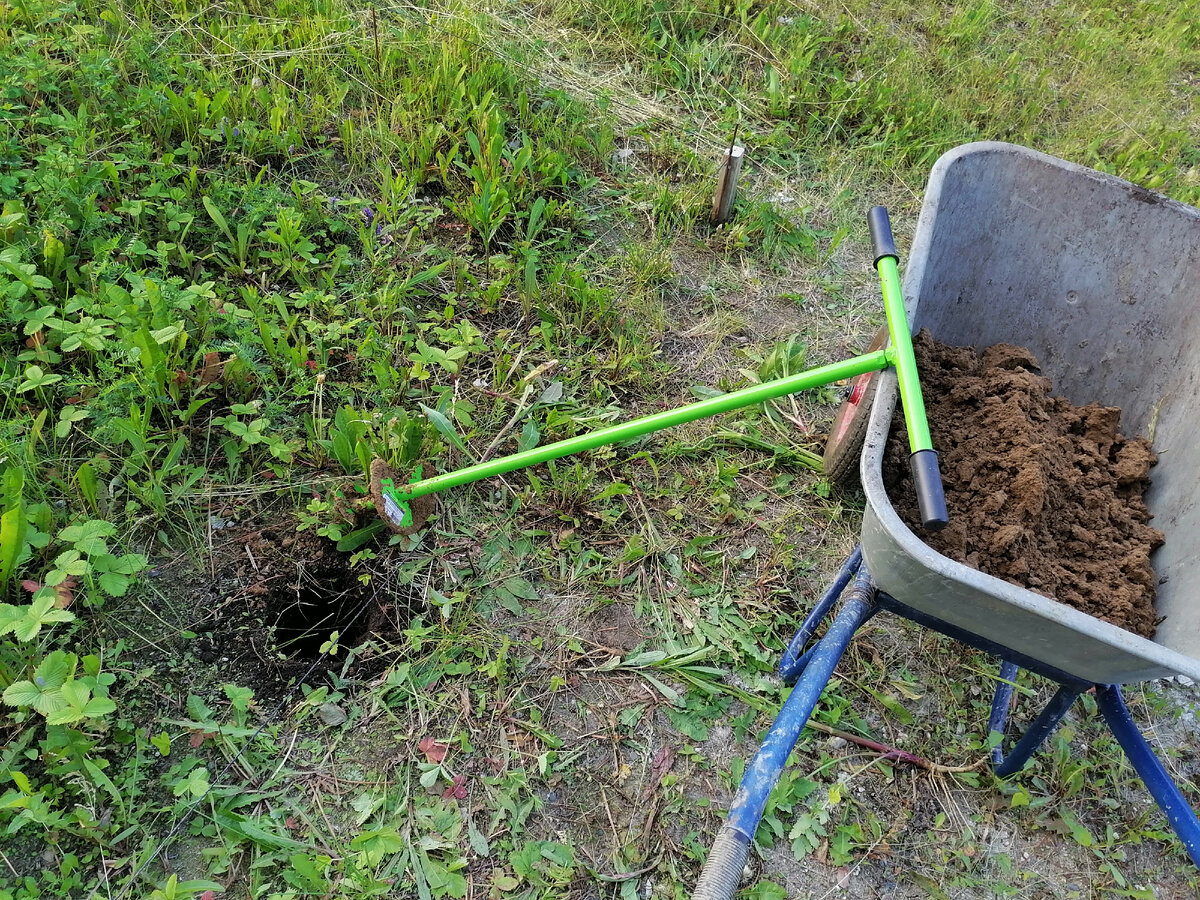 Пока строители строили крышу, решил начать возводить террасу с северной стороны дома. Я не сторонник дерева, винтовых или буронобивных свай. Все это для меня пройденный этап. Блоки и бетон – это мой материал. С ними мне нравится работать. А то, что нравится – то и получается. Смотрим процесс и что получилось. Разметил геометрию террасы. Ее размер – 3х4 м. Правильную геометрию разметить просто, а тем более с моим размером. Делается по правилу Пифагора (правило прямоугольного треугольника). Три в квадрате + четыре в квадрате = пять в квадрате. Т.е. диагональ, соединяющая два противоположные угла при моих размерах, должна быть 5 м. Выкопал буром ямы для заливки свай. Они нужны для того, чтобы морозное пучение не отодвигало террасу от фундамента дома. Терраса будет мелкозаглубленная, под ней будет всегда промерзать грунт. Поэтому, нужна хорошая подушка из не пучинистых материалов. Связал каркасы из арматуры для свай. Обработал арматуру преобразователем ржавчины. Более подробно про это я пи