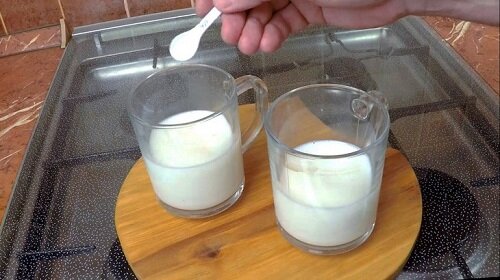 - Первым делом займемся растворением термофильной закваски «Твердые сыры» и заквасочной культуры «propionbacterium». Для этого обираем по стакану пастеризованного молока и нагреваем в разных тарах до 35 градусов. Теперь высыпаем наши закваску и культуру и тщательно перемешивая растворяем их, оставляем на 1 час;