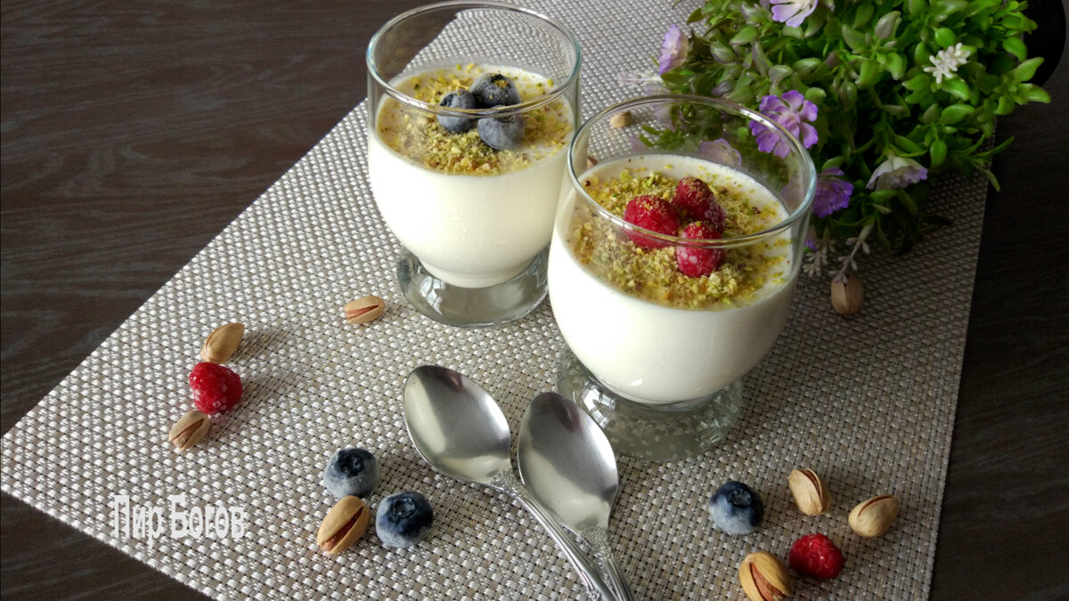 Панна-котта — это итальянский десерт из сливок, желатина и сахара. Дословный перевод этого лакомства звучит как «вареный сливки». Это нежный и мягкий десерт со сливочным вкусом и очень нежным ароматом. Готовится без крахмала, муки и выпекания. Десерт интересный и легко готовится. А разнообразить лакомство можно ягодами, фруктами, орехами, шоколадом, джемом. Порадуйте себя и близких вкусным итальянским десертом! *** Подробный рецепт можно увидеть в видео на моем канале здесь или на канале YouTube Пир Богов вот здесь 🍨. Еще там есть много вкусных рецептов. 🥗🥧Подписывайтесь))) 😉 *** Состав: 250гр сливок 33-35% 125гр молока 3,5% 50гр (4ст.л.) сахара 2 палочки корицы 50гр холодной воды 8гр желатина Фисташки и ягоды Способ приготовления: Желатин залить холодной водой. Оставить постоять, чтобы он набух. В инструкции моего желатина написано, что он должен постоять 10 минут. В кастрюлю выливаем сливки, молоко и кладем сахар с корицей. Для приготовления панна-котты лучше использовать натурал
