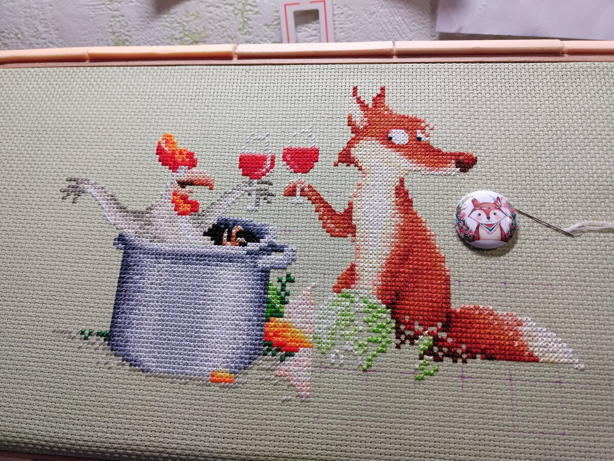 Всем привет, я рада, что вы заглянули к нашему очагу добра, рыжести и Фыр-фыр-фыр) Сегодня наша пушистая команда подводит итоги рукодельной недели. И в принципе, эти итоги даже радуют. Я совсем чуть-чуть выбиваюсь из графика работы над Званым ужином. Поняла, что ненавижу зелёный. Вышивать зелёным по зелёному - жутко. Хуже, наверное, только чёрным по чёрному. Просто посмотрите на эту хитрющую морду :D В планах было закончить сегодня полностью второй этап, чтобы осталось вышить только бэк. Но жизнь вносит свои коррективы в рукодельные планы. С другой стороны, за ночь я точно успею закончить) Заодно к Ужину я присмотрела у того же автора ещё три схемы на такую же кухонно-лисью тему. Кто бы их ещё купил :D Из позитивного на этой неделе, буквально вчера, получила лампу и теперь моё рабочее место освещено с двух сторон - сверху и справа. Кажется справа. Но это не точно. А ещё я, обещавшая себе не вписываться больше ни в какие онлайны, но всё равно вписалась. Буду вышивать вот так