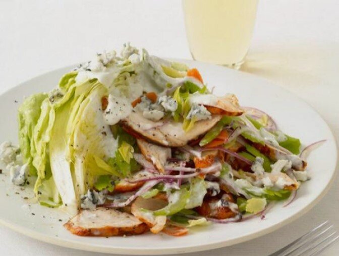 Салат из курицы «Баффало» Этот салат наполнен всеми вкусами классических острых крылышек «Баффало». Готовится из сочной куриной грудки, обжаренной на гриле со сливочным маслом и острым соусом, салата Айсберг, красного лука, сельдерея, моркови и обязательной заправки из голубого сыра. Это полезнее жареных крылышек и не так «грязно». Салат отлично походит для ланча или лёгкого ужина. Пищевая ценность одной порции: Калории 354, всего жиров 8 г., насыщенные жиры 8 г., белки 36 г., углеводы 12 г., клетчатка 3 г., холестерин 119 мг., натрий 1061 мг., сахар 0 г. Ингредиенты к рецепту: 1 кочан салата Айсберг, разрезанный на 4 части 2 ст. л. несолёного сливочного масла, растопленного 0,5 ст. острого соуса 2 большие куриные грудки без кожи и костей (примерно 600 гр.) 1 ст. л. оливкового масла extra-virgin 1 ст. раскрошенного голубого сыра 0,5 ст. сметаны 4 стебля сельдерея, тонко нарезанных + 1/4 ст. рубленых листьев сельдерея Четверть небольшого красного лука, тонко нарезанная 1 морковь, тонк