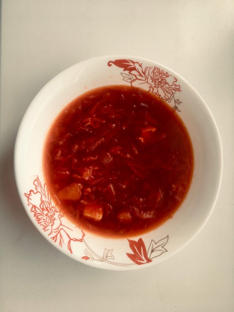 Для борща нам понадобится: мясо на кости - 450 г, картофель - 2-3 шт, капуста - 300 г, свекла - 2 большая, томатная паста - 1 ст.л, чеснок - 2 зубчика, сахар, соль перец по вкусу. Приготовление борща: 1. Налить в кастрюлю примерно 3 литра воды, положить мясо, довести до кипения. Убрать появившуюся пену. Свеклу моем, разрезаем пополам и добавляем к мясу вариться. Убавить огонь, варить бульон на медленном огне. Прикрыть крышкой, варить 1.5 часа, до мягкости мяса и свеклы. 2.Далее подготавливаем остальные ингредиенты нарезаем картофель небольшими кусочками, шинкуем капусту. Обжариваем лук, морковь, добавляем томатную пасту и еще немного обжариваем. 3. Когда мясо и свекла сварилась достаем из кастрюли. Добавляем в кастрюля картофель и капусту, как они сварились добавляем пережарку. 4. Свеклу очищаем от кожицы и трем на терке, мясо нарезаем на кусочки и возвращаем все обратно в кастрюлю. Добавляем сахар, соль, перец и выдавливаем чеснок. Все варим 5 минут. Приятного аппетита!
