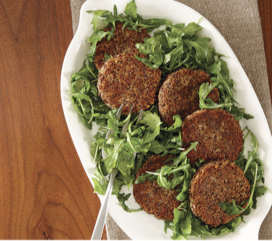 Эти хрустящие, в меру сладкие котлеты вкусны со слегка заправленной рукколой. Ингредиенты Приготовление Доведите до кипения воду в 3-квартальной кастрюле. Добавьте киноа, уменьшите огонь до среднего и варите, периодически помешивая, до мягкости, около 12 минут. Слейте воду и тщательно промойте прохладной водой. Слейте воду, надавливая на сито обратной стороной деревянной ложки, чтобы удалить как можно больше воды. Переложите в кухонный комбайн и добавьте фасоль, овсяные хлопья, кедровые орехи, горчицу, вустершир, тимьян, семена фенхеля, лимонную цедру, 1 ч. л. соли и 1/2 ч. л. перца. Обработайте до получения густой, гладкой пасты. Влажными руками сформируйте из смеси восемь котлет толщиной 1/2 дюйма. Разогрейте масло в 12-дюймовой антипригарной сковороде. Добавьте котлеты и готовьте, перевернув один раз, до румяной корочки с обеих сторон, всего 8 минут. Подавайте горячими.