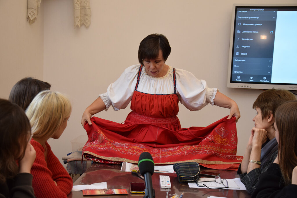 Прежде чем приступить непосредственно к самой вышивке, участники мастер-класса погрузились в историю традиции данной техники, узнали о том, на каких элементах одежды (фартуки, подзоры, сарафаны) чаще всего можно встретить привычные для этой традиции узоры. Так, в начале девятнадцатого века распространение получила хлопчатобумажная ткань - кумач, на ней было проще всего было использовать тамбур. Техника довольно проста в исполнении; особенностью является то, что тыльная сторона остаётся практически чистой, с минимальным коли