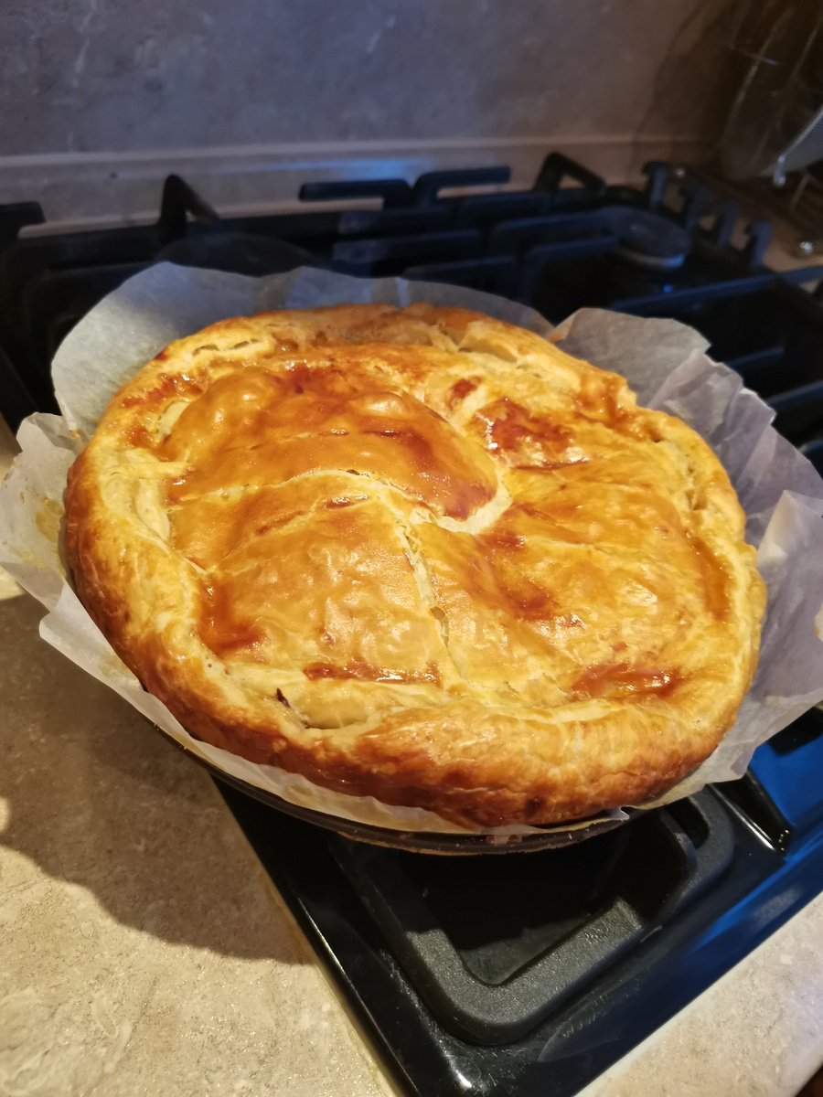 Добрый день, друзья! Сегодня готовим очень простой вкусный пирог из капусты с яйцами. Первым делом разморозим слоёное тесто. Отварим 4-5 средних яиц, капусту (лучше взять качан побольше, потому что потом она ужарится)нашинкуем. Разогреваем сковороду, наливаем подсолнечное масло и выкладываем нашу капусту. Жарим минут 20-25. Не забудьте посолить. Как капуста будет готова, очищаем яйца и смешиваем с ней. Тесто раскатываем по форме (у кого какая). Застилаем пергаметной бумагой нашу форму, смазываем маслом кладём тесто. Следом выкладываем начинку. Сферху закрываем оставшимся тестом и выравнивание по краям. Разогрейте духовку до 180°. Взбейте одно яйцо венчинком и смажьте наш пирог. После, его можно отправлять в разогретую духовку. Запекаем до румяной корочки! Всем приятного аппетита!