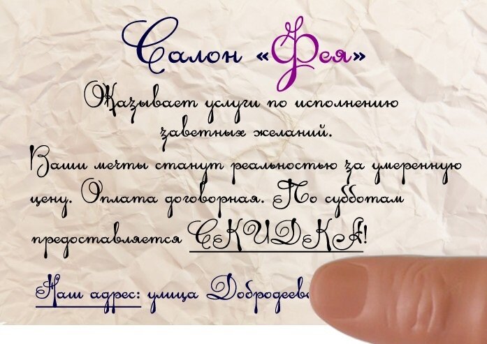 Третий облом окончательно отбил желание искать салон с банальным названием «Фея», но с оригинальным рекламным объявлением: