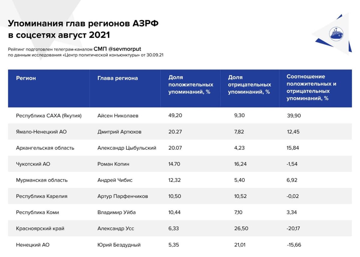 Лидером среди 85 глав субъектов РФ по доле позитивных упоминаний в августе стал Айсен Николаев (49,2%), на четвертом месте по России – Дмитрий Артюхов (20,27%), шестой - Александр Цыбульский (20,07%), 17-й - глава Чукотки Роман Копин (14,7%).