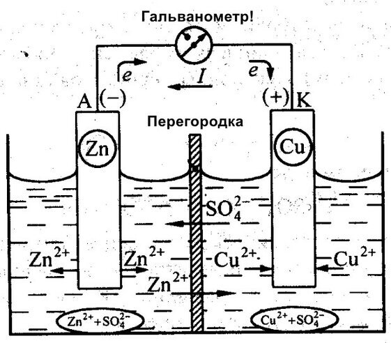 Рассмотрим гальванический элемент Якоби—Даниэля (схема приведена на рис. 2). Он состоит из цинковой пластины, погруженной в раствор сульфата цинка, и медной пластины, погруженной в раствор сульфата меди. Для предотвращения прямого взаимодействия окислителя и восстановителя электроды отделены друг от друга пористой перегородкой.
