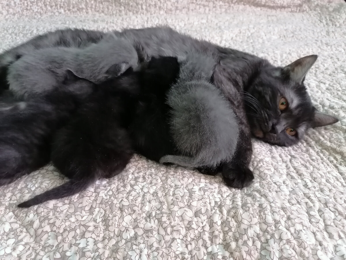 Важным условием хорошей лактации является достаточное количество жидкости в организме. Поэтому нужно контролировать, чтобы кошка много пила. Поблизости от гнезда следует поместить посуду с чистой свежей водой. В период вскармливания котят молоком у матери-кошки сохраняется повышенный аппетит. Потребность в еде увеличивается в три-четыре раза и зависит от числа родившихся малышей и их возраста. Кормящую кошку кормят обильно и разнообразно, несколько раз в сутки. Пищи следует давать столько, сколько она захочет. К примеру, кошка с массой пять килограмм родила шестерых малышей. Для полноценного питания к её обычному рациону, составляющему триста ккал, следует добавить по сорок две ккал на каждого котёнка. Таким образом её суточный рацион будет содержать 550 ккал. По мере роста котят и постепенное введение им дополнительного прикорма, калорийность рациона мамы постепенно сокращают. Так как с материнским молоком в организм котят поступают белки, жиры, витамины и минеральные вещества, все эт