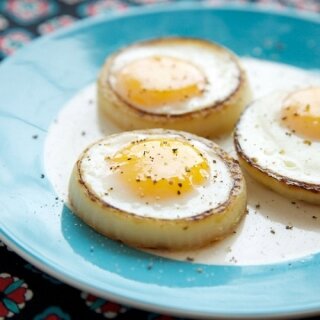 Нарежьте лук кольцами, самый большой, выложите в смазанную маслом сковороду на среднем огне. Когда одна сторона слегка подрумянится, переверните кольцо лука и разбейте яйцо посередине. Если вы хотите, чтобы яичный желток был виден, аккуратно промокните верхнюю часть яичного желтка бумажным полотенцем и удалите белок поверх него. Готовьте, пока яйцо не будет готово. Вам понадобится: лук репчатый большой, яйца. Приятного аппетита.