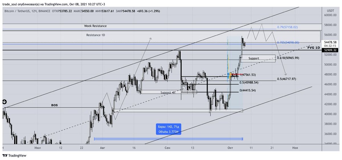 Прошедшие сутки мы провели в узком диапазоне 54600 - 53700, без особых изменений. Капитализация рынка 2286 млрд., индекс доминирования 43.93% Индекс страха и жадности находится в диапазоне жадности на отметках 74. На данный момент я придерживаюсь плана, о котором описывал в прошлом обзоре, ожидаю дистрибуцию в диапазоне Сопротивления 1Д ТФ, а так же с возможным заходом в Недельное сопротивление, диапазон 58200 - 54098. Пока явных признаков Шорта на младших ТФ я не наблюдаю, не считая перекупленности на многих Индикаторах. На графике отметил зоны Интереса - это поддержка 52000 - 50481, а так же ниже точка РОС на отметках 48000. Впереди у нас рынок выходного дня, лучше воздержаться от торговли, так как возможна сильная волатильность и манипуляции. И уже с понедельника смотреть на график. Фондовые рынки завершили торги четверга ростом. Dow Jones подорожал на 0.98%, индекс S&P 500 вырос на 0.83%, индекс NASDAQ Composite подорожал на 1.05%. Индекс доллара опустился на 0.07% до 94.