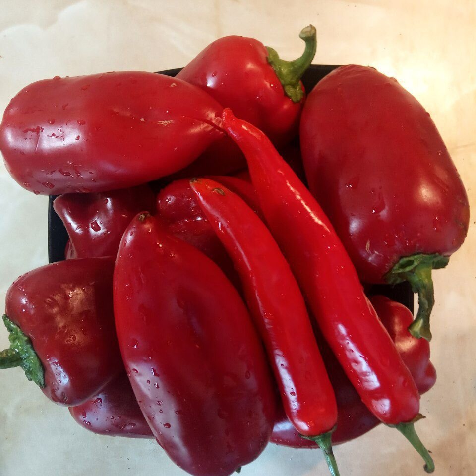Зачем томаты, когда сезон перцев? Айвар - балканская икра из сладких перцев. Вкус, цвет - шикарнейшие. Берём: Перцы моем, сушим и запекаем целиком. В фольге в духовке или на гриле. Перцы должны размягчиться, выделившийся сок подпалиться и дать дымный аромат. На это уйдет 60-80 минут (зависит от температуры). Есть один интересный момент. Даже если не добавлять острые перцы, айвар может получиться немножко жгучим. На этот счёт у нас есть две теории. Фишка в том, что и сладкий, и обычный острый перец относятся к одному роду - capsicum annum. По сути сладкий перец - это вырожденный острый. Поэтому капсаицин в нанообъемах может содержаться в семенах и плаценте (то, что обычно удаляется до готовки). При запекании он плавится и распределяется по всему плоду. Отсюда и внезапная острота. По второй теории, виновато перекрестное опыление Даём перцам остыть. Потом снимаем с них шкурки, убираем семена и перегородки. Мякоть нарезаем совсем мелким кубиком (олдскул) либо пробиваем погружным блендером