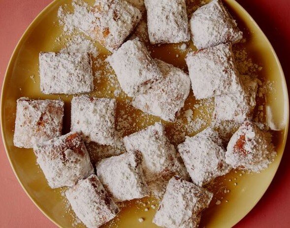 Ингредиенты к рецепту: 1 ст. тёплого цельного молока 1 пакетик (7 гр.) активных сухих дрожжей (2 и 1/4 ч. л.) 1/3 ст. сахара-песка 110 гр. несолёного сливочного масла, растопленного 0,5 ч. л. крупнозернистой соли 1 большое яйцо, взбитое 3,5 ст. муки высшего сорта + дополнительно для посыпки Рапсовое масло (канола), для фритюра (примерно 8 ст.) 3,5 ст. сахарной пудры В Новом Орлеане пышные пончики бенье подают, щедро посыпая сахарной пудрой, даже когда отпускают на вынос в бумажных пакетах. Вы тоже можете подхватить дух Нового Орлеана и раздать всем пончики в бумажных пакетах. Или просто разложите их на противне, посыпав сахарной пудрой. Какой бы вариант вы ни выбрали, обязательно ешьте их, пока они горячие. Ингредиенты к рецепту: 1 ст. тёплого цельного молока 1 пакетик (7 гр.) активных сухих дрожжей (2 и 1/4 ч. л.) 1/3 ст. сахара-песка 110 гр. несолёного сливочного масла, растопленного 0,5 ч. л. крупнозернистой соли 1 большое яйцо, взбитое 3,5 ст. муки высшего сорта + дополните
