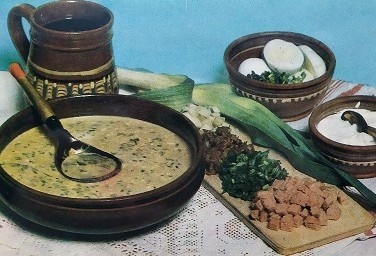 "Есть и пить нужно столько, чтобы наши силы этим восстанавливались, а не подавлялись" - Цицерон. Квас хлебный 300 г, картофель 75 г, морковь и репа по 20 г, редис 20 г, лук зеленый 30 г, огурцы 65 г, сметана вареного яйца, сахар 5 г, горчица столовая 2 г, зелень 5 г, соль 5 г. Картофель вымыть и сварить в кожуре. Морковь и репу очистить и сварить отдельно. Картофель охладить, очистить. Нарезать овощи мелкими кубиками. Лук нашинковать и растереть с небольшим количеством соли до появления сока. Продукты смешать, залить заправленным горчицей квасом. Налить в тарелку и посыпать зеленью. Если окрошка недостаточно острая, можно добавить к ней тертый хрен. Отдельно подать сметану. Вместо кваса можно использовать кефир, разведенный холодной кипяченой водой.