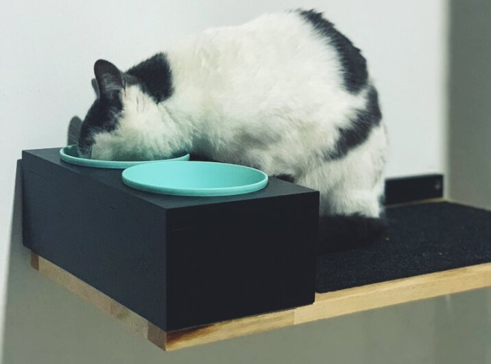 У домашнего мурлыкающего питомца должен быть необходимый ему минимум вещей: лоток, место для сна, миски с едой и водой, игрушки. В каждом конкретном случае вариации этих атрибутов для нормальной жизни кошки могут быть разными: вместо плошки с водой - питьевой фонтанчик, вместо лежанки - домик или большой игровой комплекс и т.д. Но вот что касается организации места для питания, то, уверена, в большинстве случаев оно у многих находится на кухне (или в коридоре рядом с ней) в укромном уголке. Тут и хозяину сподручнее кормить своего котейку и убрать потом все можно легко и быстро. А миски с кормом и водой обычно стоят на полу, иногда на специальных ковриках. Однако есть мнение, что кошке, как и человеку надо есть не с пола, а со специального места, которое находится на возвышении. Например на специальной полке, что прибита к стене над уровнем пола или просто на некой удобной подставке. Мол мы сами едим за столом, а бедная наша животинка на полу. И тут суть не в том, что мы свою