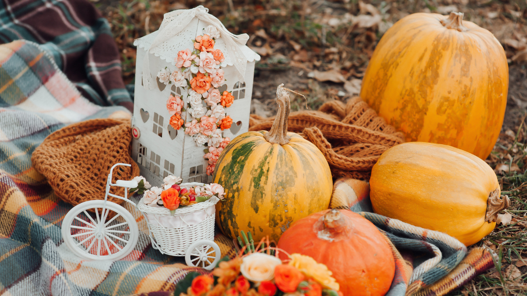 - На улице — здесь много пространства, которое сложно оформлять. Используем природные мотивы: арка, украшенная опавшими листьями, сезонные овощи или их имитация, деревянная или плетёная мебель. Остальное украсит сама природа, нужно только подыграть ей оттенками и фактурами.