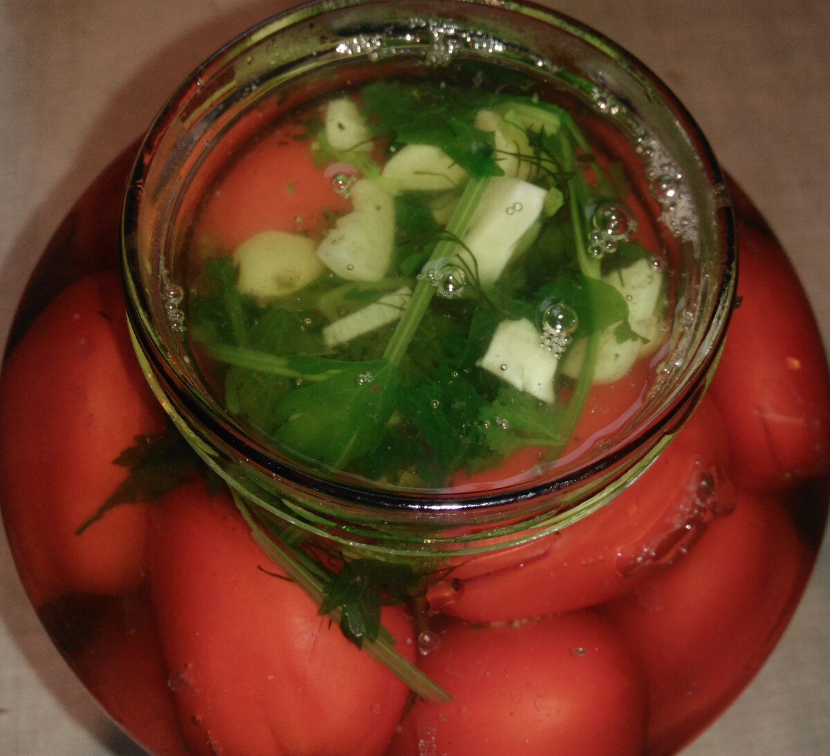 Ингредиенты: Помидоры небольшого размера Соль Сахар Горчица порошковая Хрен листовой Укроп Петрушка Чеснок Семена укропа Чёрный перец горошком Лавровый лист Гвоздика Способ приготовления: Помидоры небольшого размера потребуется примерно около трёх килограмм. Перед тем как начнём готовить, необходимо помидоры замочить на пару часов в холодной воде. Можно взять кастрюлю или большую посудину в виде салатницы и замачиваем помидоры в холодной воде. Промыть помидоры можно сразу до замачивания. Подготовьте заранее трёх литровую банку с крышкой. Тщательно промойте банку и дайте ей высохнуть. Прошло несколько часов, начинаем готовить помидоры. Наливаем в кастрюлю воды и ставим ее на огонь. Потребуется примерно около полтора литра воды. Сейчас мы будем готовить рассол, поочередно добавляя ингредиенты в воду. Мы не будем ждать, пока закипит вода, всё закладываем на стадии закипания воды. Берём лист хрена, разламываем его на части и добавляем в кастрюлю. Укроп возьмите тот, что с зонтиками. М