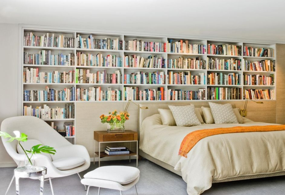 Одновременное проектирование и установка книжного шкафа и изголовья над кроватью позволяет создать единое целое, органично сочетающееся друг с другом. Подойдите творчески к выбору материалов для изголовья и стеллажей; хотя 1,875-сантиметровая фанера является стандартом при изготовлении стеллажей "сделай сам", стекло, металл и переработанные материалы могут придать пространству уникальную изюминку. Чтобы почерпнуть идеи, просмотрите несколько дизайнерских сайтов и журналов, делая закладки и вырезая фотографии помещений, которые вас привлекают. Размер изголовья Размеры книжной полки и заголовка будут иметь такое же большое влияние на общую эстетику проекта, как и стиль и отделка шкафа (шкафов). Проектируйте изголовье так, чтобы оно выступало как минимум на 5 см по обе стороны кровати; например, если ширина кровати составляет 190 см, изголовье должно быть шириной 2 м. Высота зависит от предпочтений. Поскольку вы будете устанавливать книжный шкаф над изголовьем, общий вид готового издели