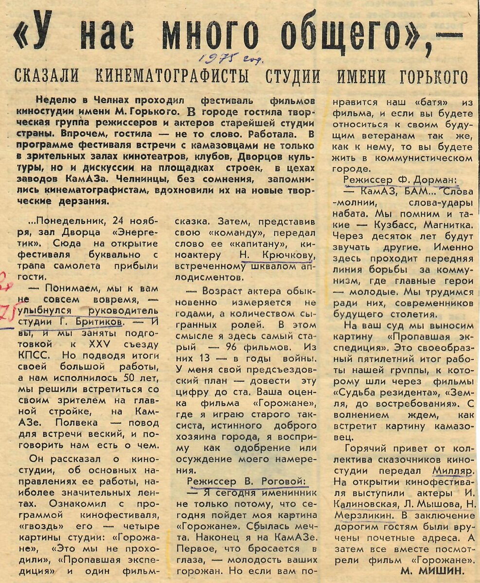В конце ноября 1975 года в Набережных Челнах проходил фестиваль фильмов киностудии имени Максима Горького. В наш город приезжали известные советские артисты и деятели кино. Вот как об этом событии писала газета «Социалистическая Индустрия на строительстве Камского автозавода» от 29 ноября 1975 года. Особое внимание было к Николаю Крючкову - народному артисту СССР. Подробнее об этом очень хорошем артисте можно прочитать здесь: http://chtoby-pomnili.com/page.php?id=241 25 ноября 1975 года в актовом зале ремонтно-инструментального завода прошла встреча с известными артистами. Посмотрите сохранившиеся фотографии. Стоит сказать, что визит Николая Крючкова в 1975 году в Набережные Челны, был далеко не первым. Внизу впечатления Николая Крючкова от его поездки на КАМАЗ, опубликованные в газете «Советская Культура» от 30 марта 1973 года. Вместе с Николаем Крючковым в составе творческой группы в тот день на КАМАЗ приезжал Милляр Георгий Францевич. Помните Бабу-Ягу и Кащея Бессмертного из советск