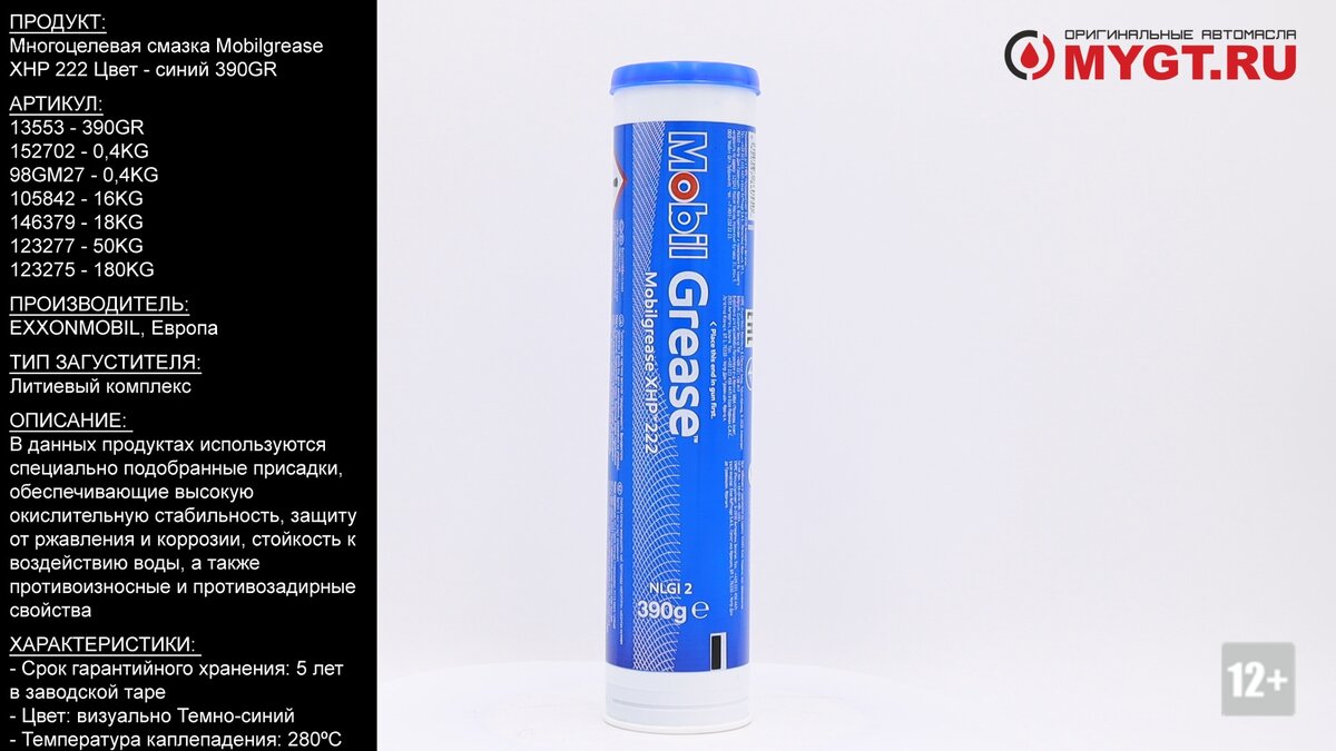Продукт: Многоцелевая смазка Mobilgrease XHP 222 Цвет - синий 390GR Наш телефон: 8-800-550-57-22 ПН-ПТ 9.00-17.00 (МСК+4) Артикул: 13553 - 390GR 152702 - 0,4KG 98GM27 - 0,4KG 105842 - 16KG 146379 - 18KG 123277 - 50KG 123275 - 180KG Производитель: EXXONMOBIL, Европа Тип загустителя: Литиевый комплекс Ссылка для покупки: https://mygt.ru/oil/mobil/mobil-grease-xhp-222-04-kg.html Продукты Mobilgrease ХHP™ 220 представляют собой смазки с увеличенным сроком службы на основе литиевого комплекса, предназначенные для широкого спектра применений и жестких рабочих условий. Данные смазки были разработаны с использованием передовой запатентованной технологии производства продуктов на основе литиевого комплекса с целью достижения более высоких эксплуатационных характеристик. Состав данных смазок обеспечивает эффективные эксплуатационные характеристики в условиях высоких температур, высокие адгезионные свойства, структурную стабильность и стойкость к воздействию воды. Данные смазки