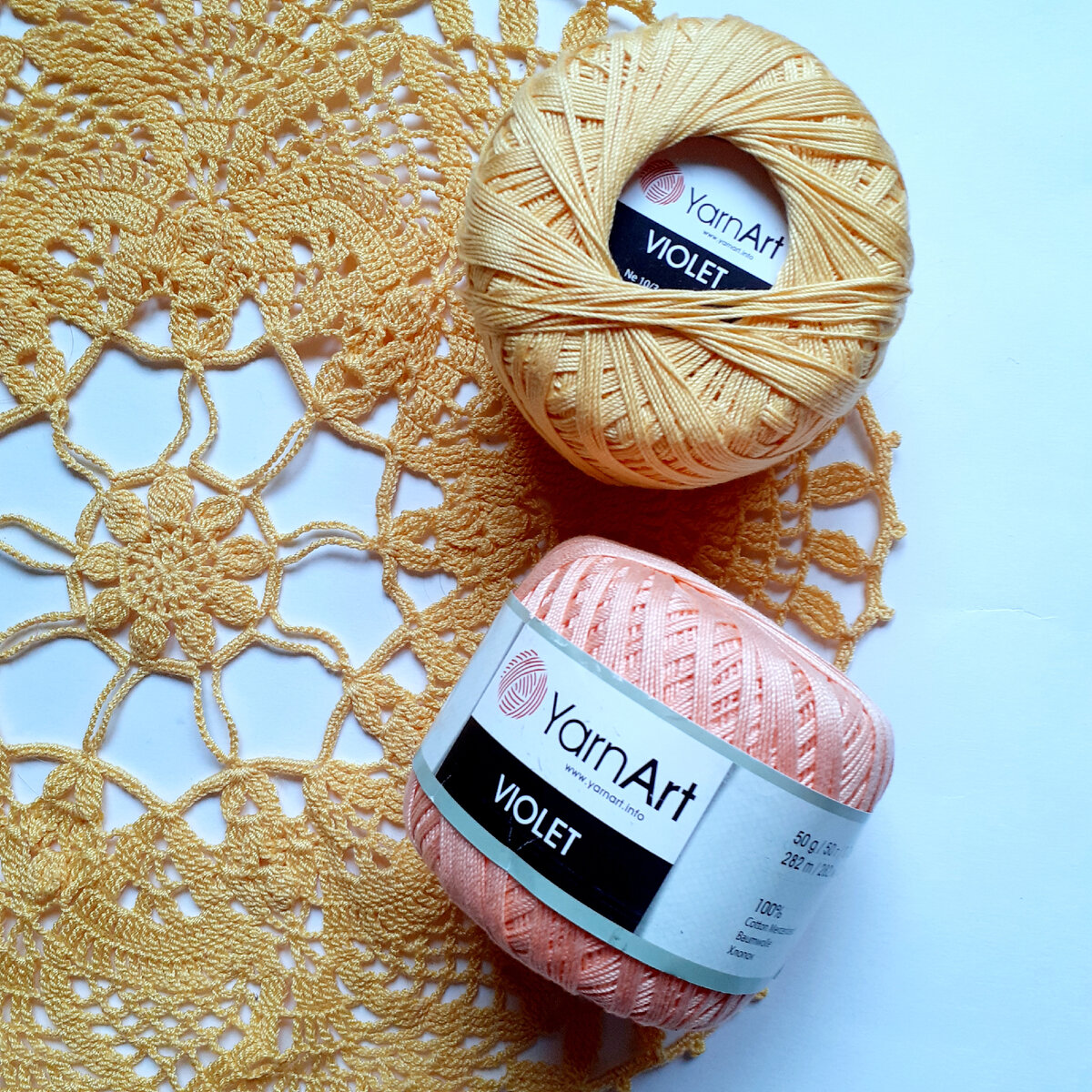 Когда постоянно вяжешь, то появляются предпочтения в пряже. В моей вязальной жизни на первом месте стоит хлопок. Впрочем, в этом нет ничего удивительного, лучше всего для вязания крючком подходит именно хлопковая нить, упругая, в меру жёсткая, гладкая. Ассортимент хлопка велик. Мой топ-5 включает в себя следующую пряжу… 1 место - ЯрнАрт VIOLET (50 г/282 м) (производство Турция) Рекомендуется крючок 2,5, но я беру всегда не больше 1,5. На мой вкус, данная пряжа идеальна для различного ажура, вяжу из неё салфетки. Однажды вязала платье из мотивов тёмно-синего цвета. Незаменима она для цветочков-листиков и тому подобной мелочёвки, а также всевозможных украшений, например, браслетов, серёжек, брошек. Вязала из неё и шкатулки, и кукол… Как говорится, пряжа на все случаи жизни. В запасах больше всего расцветок именно VIOLET. Отлично получаются из данной пряжи объемные элементы, например, "попкорны", смотрите ниже... 2 место «Ромашка» (75 г/320 м) (производство К-т им С.М. Кирова) Первый мото