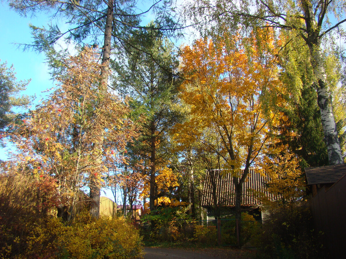 А вокруг такая красота. К вечеру, темнеет теперь рано, сидя на качели, я принимала осенние ванны. Пред глазами была огромная картина художника по имени Осень. Он не жалел ярких красок.