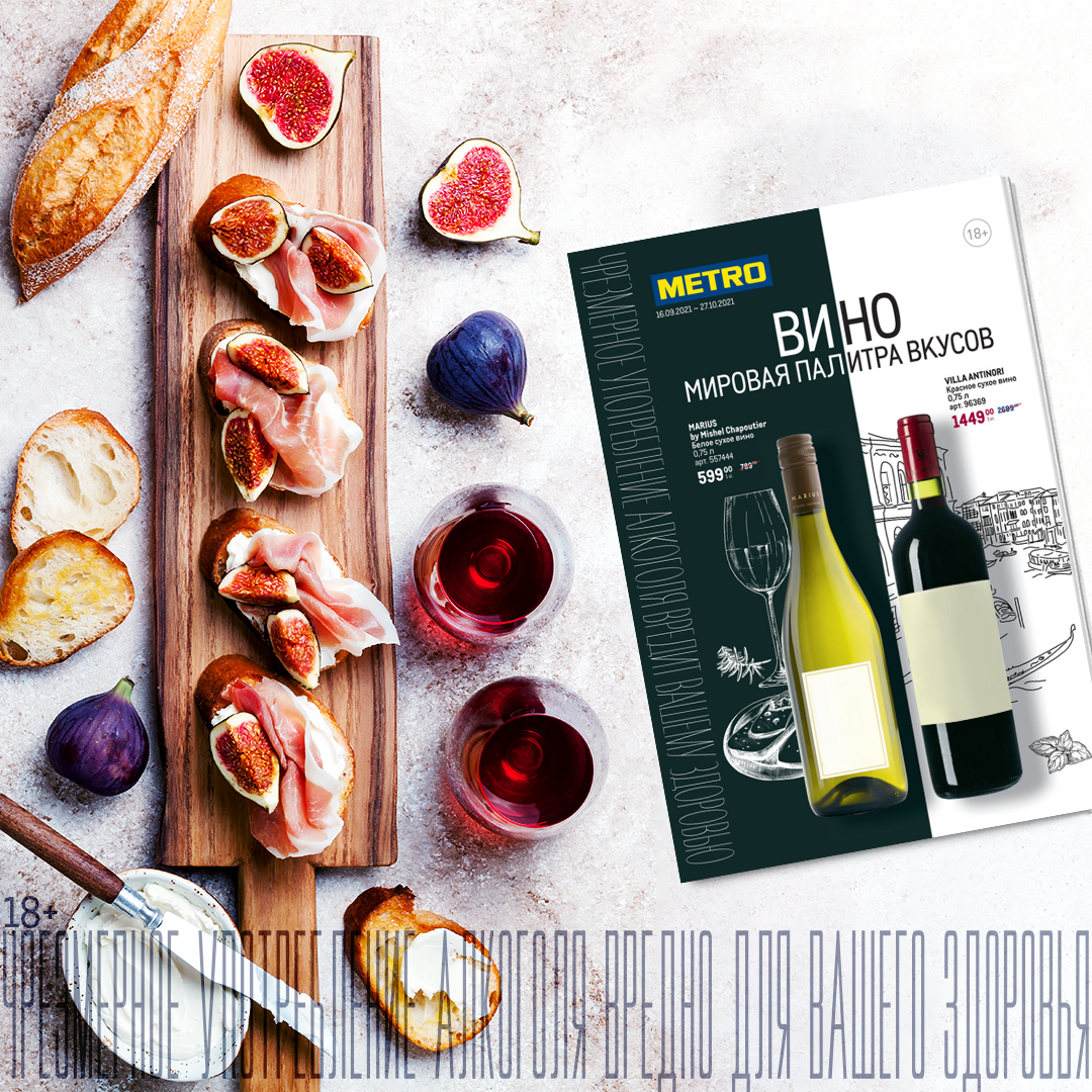 В METRO до 27 октября 2021 года проходит винная ярмарка. К ней выпущен специальный каталог, который можно найти на сайте и в торговых центрах. Великий Пушкин когда-то писал: «Все флаги в гости будут к нам, и запируем на просторе». И действительно, если перелистать каталог «Вино. Мировая палитра вкусов», в нём без труда можно обнаружить практически все флаги ведущих мировых винных держав. Здесь степенная французская классика и горячее дыхание гордых испанских идальго перемежается с изысканным вкусом вин Италии и Португалии. Немецкие рислинги поражают своей звенящей кислотностью, а грузинские братья ркацители и саперави танцуют с саблями под звон стекла бокалов. При единовременной покупке от 6 бутылок из ассортимента акции вы получите скидку 10%*