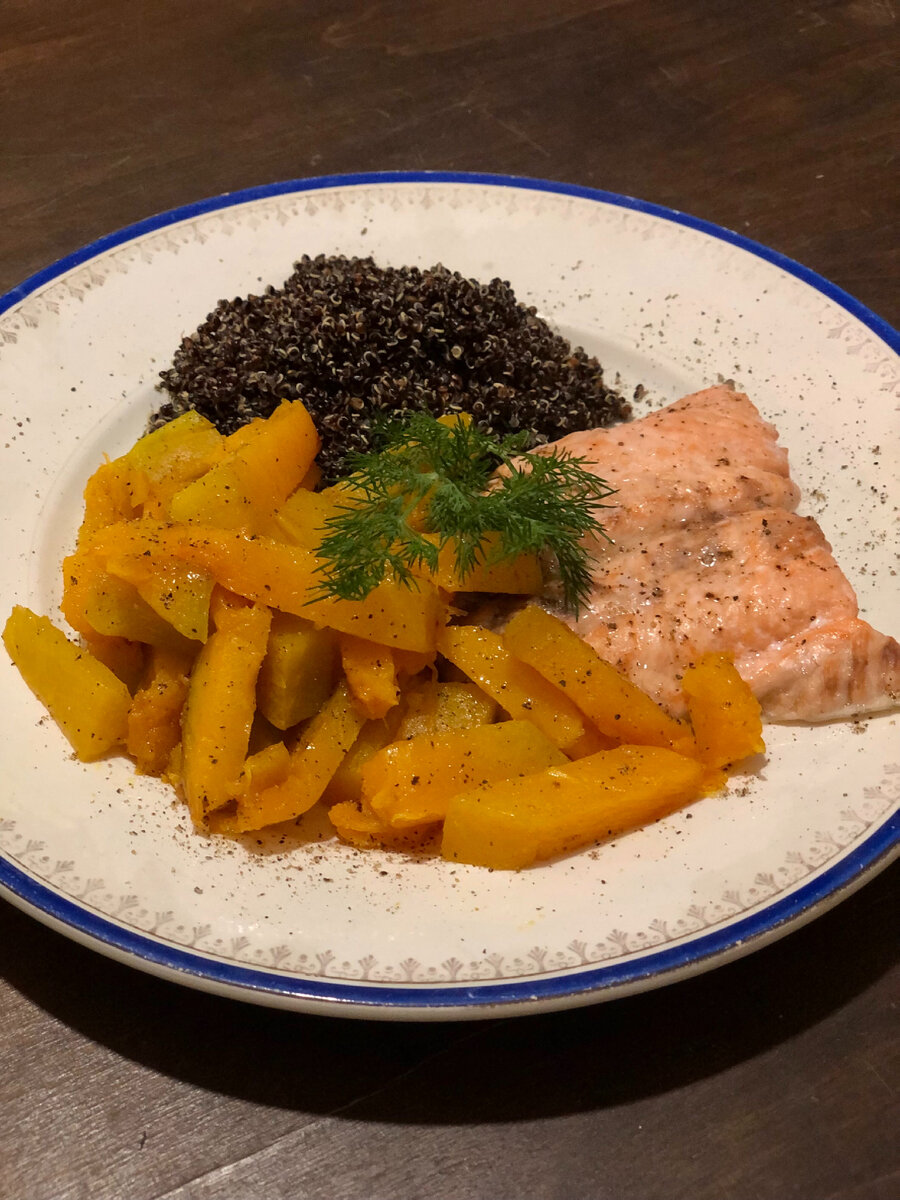Бывают в мире продуктов беспроигрышные комбинации, это одна из них. Вы получите неизгладимое впечатление от этого сочетания. Помните, что всё имеет значение. Мускатная тыква: мякоть плотная, сладкая, почти сухая. Нарежьте брусочками толщиной 1,5-2 см. Приправьте сванской солью. Жарьте на топлёном масле под крышкой. Минут 20, до размягчения. Киноа: чёрная киноа особенная, во вкусе отчётливо проявляется мак. Оболочка слегка хрустит, лопается на зубах. Составляет удачный контраст нежной мякоти тыквы, вместе создают яркое впечатление. Залить холодной водой 1:2 ( 1 часть киноа, 2 части воды), довести до кипения и варить на тихом огне около 20 минут, сначала под крышкой, последние 5 минут можно открыть, крупа должна разбухнуть, вода - впитаться и выкипеть. Проявятся белые хвостики, будто проросли семена. Форель: Конечно, лучше охлаждённая. Если же рыба была заморожена, она должна медленно и полностью растаять в холодильнике. Готовим филе на коже, на дно холодной сковороды наливаем тонкий