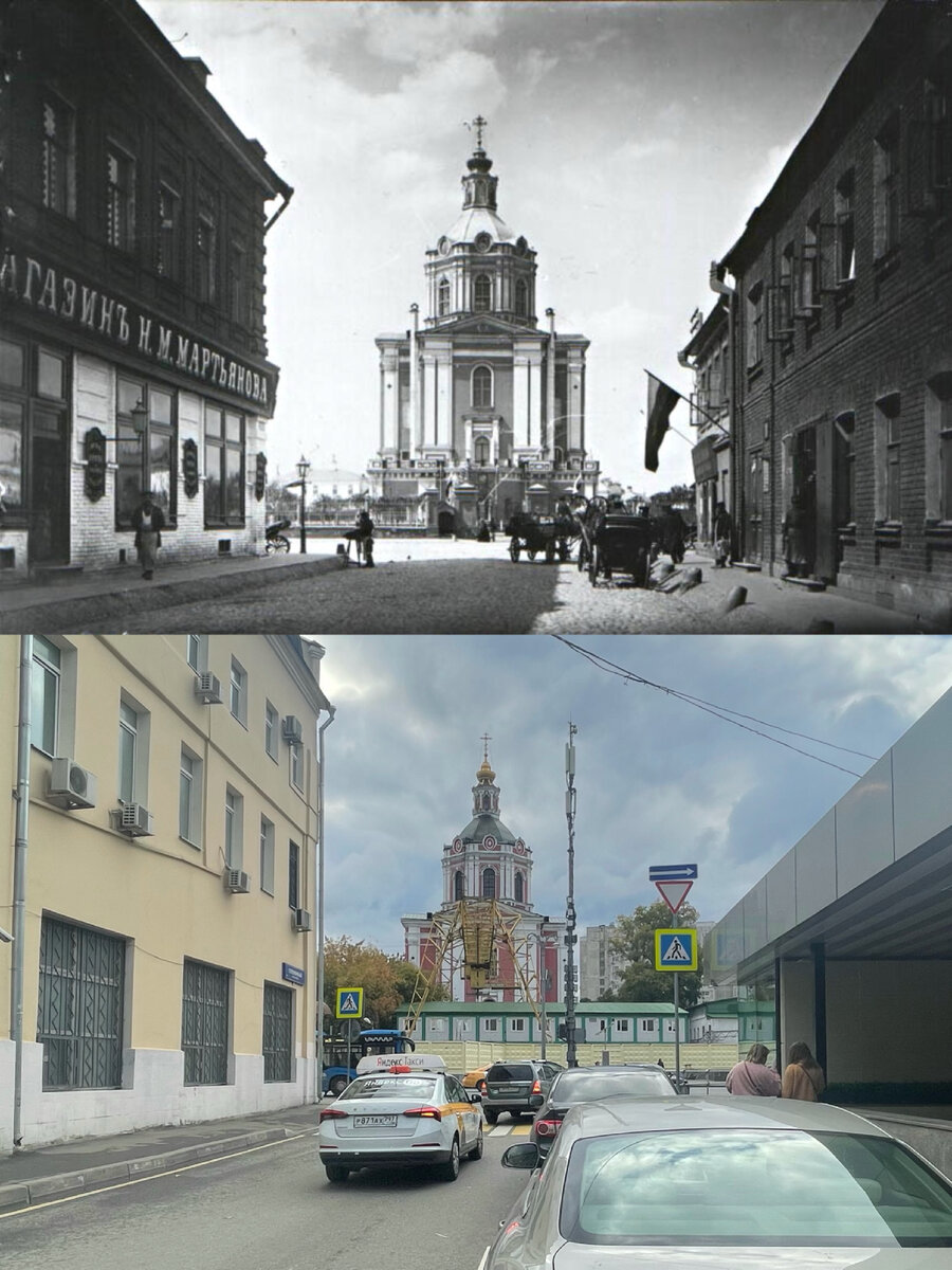Приглашаю вас отправиться в новое путешествие в формате было/стало по Москве. Сегодня мы посмотрим на то, как изменился город в районе Серпуховской площади, изменений тут масса. Также мы воссоздадим несколько объектов со старых фотографий в современной реальности. Отправляемся в путешествие! 1) Вид на церковь Вознесения Господня за Серпуховскими воротами 1913 – 2021 гг. Величественный храм Вознесения Господня был построен в XVIII веке в стиле барокко по проекту архитектора Доменико Трезини. В начале XIX века храм перестраивали. В советские годы церковь закрыли, ограда церкви и несколько построек на территории были снесены, также была сломлена колокольня храма. В наши дни колокольня восстановлена, но большую часть старой территории храма занимает московский метрополитен. 2) Мальчик торгует у ограды церкви Вознесения Господня за Серпуховскими воротами 1898 год – 2021 гг. Как я писал выше, ограда храма была снесена, теперь здесь проходит тротуар и левее расположен выход из метро "Серп