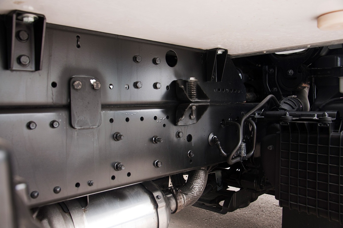 Начнём с основы любого грузовика – с рамы. Вряд ли многие вспомнят, но у HD78 она была бутылочной формы – переменной ширины. У ЕХ8 она другая – одинаковая по всей ширине (860 мм против 753 мм в широкой части у HD78). Рама лестничного типа – с поперечинами, которые соединяют боковые лонжероны. Профиль лонжеронов тоже изменился. Толщина металла – 6 мм – осталась неизменной, но высота и ширина стали иными: 216х70 мм вместо 193х60 мм у HD78. Одним словом, рама стала шире и прочнее. И всё это сделано не по капризам инженеров, а по причине довольно высокой грузоподъёмности – до 5,4 т (понятно, что с некоторыми тяжёлыми надстройками она может быть ниже). Впрочем, 5,4 т – потолок формальный. Передний мост ЕХ8 выдерживает 3,1 т, допустимая нагрузка на задний мост – 6,4 т. Так что небольшого перегруза ЕХ8 не боится. Просто так было легче сертифицировать машину в России: не пришлось менять тормоза. И уж раз коснулись мостов и тормозов, поговорим про них.