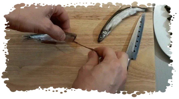 Мойва – вкуснейшая небольшая морская рыбка. Однако чистить ее сплошная морока! Была морока, до сегодняшнего дня! главное простой чистки этого морского деликатеса от костей и потрохов, которая не займет у вас много времени. Перед очисткой рыбы мойву следует полностью разморозить (если продукт был заморожен), также вам понадобятся деревянная доска, острый нож, пакет для отходов, салфетки и две тарелки подходящего размера. Очистка рыбы: Сначала удалите у рыбы голову и вытяните с ней все внутренности. Делать это лучше руками, без помощи каких-либо инструментов. Возьмите небольшой острый нож и разрежьте брюшную полость до самого хвоста. Делать это следует одним единственным движением, после того, как нож был введен достаточно глубоко в брюшко. Быстро и четко разделайте таким образом все тушки. Затем возьмите салфетку и уберите с ее помощью черную пленку. Это очень важно сделать, в противном случае у мяса будет неприятный вкус. Теперь выложите тушки рыбы брюхом вниз и проведите пальцем по хр