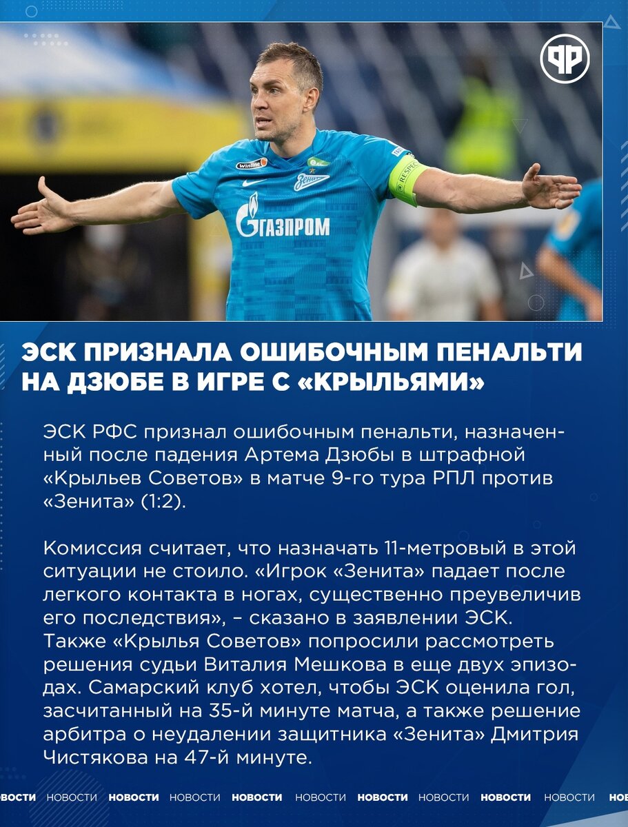 Эск признала ошибочным пенальти на Дзюбе в игре с "Крыльями"