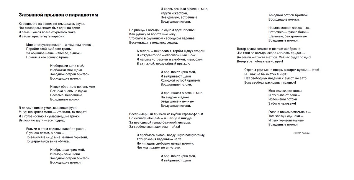 Сценарий назывался "Белый вальс" и именно на этот сценарий Высоцкий долго и мучительно писал одноименную песню. Получилась замечательная песня, полностью соответствовавшая авторскому сценарию о судьбе офицера, уходящего в "горячую точку". Но к тому времени от первоначального сценария уже ничего не осталось. Возможно, эти три включенные в фильм песни были своеобразной компенсацией автору за напрасно проделанную работу. Сегодня хочется подробнее остановиться на одной из них. Её называют и "Воздушные потоки", и "Затяжной прыжок", и по первой строке. Беловой автограф озаглавлен "Затяжной прыжок с парашютом". Наверное, так и следует её называть.