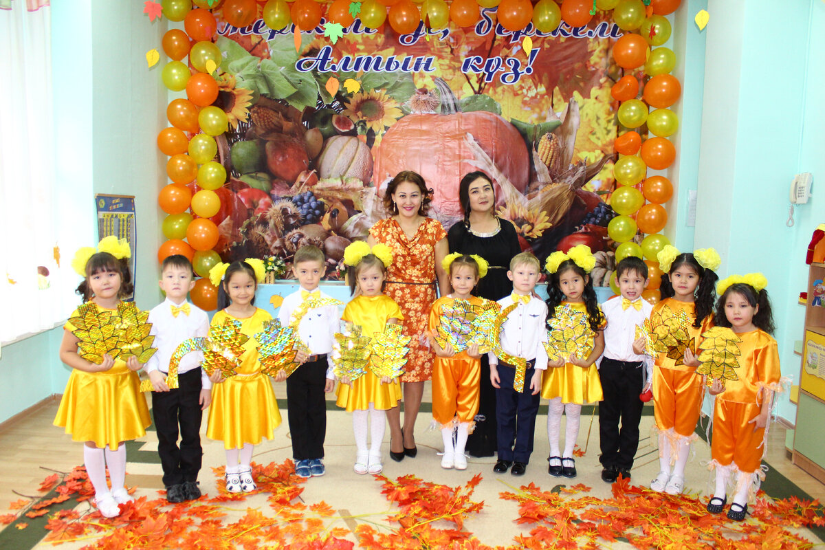 Жүргізүші: Сәлеметсіңдер ме балалар! Міне, көңілді жас бітіп, өлкемізге алтын күз мерекесі келіп жетті. Айнала қызыл, сары, қоңырқай түске боянып, көздің нұрын алады. Мереке құтты болсын балалар!