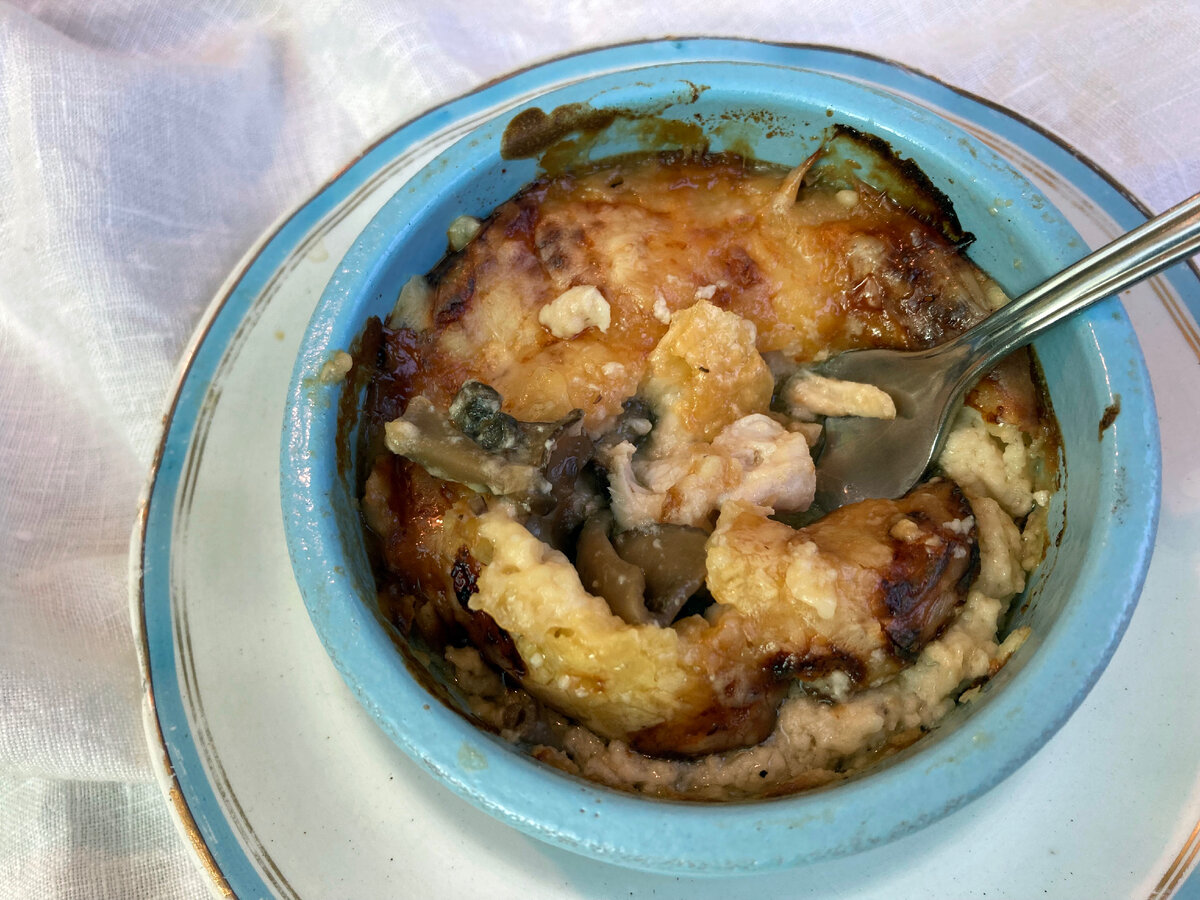 Если бы я готовила в формате закуски в крошечных кокотницах, то ограничилась бы одними грибами. Но, поскольку я готовлю полноценное самостоятельное блюдо, то курица в нем будет очень уместна.