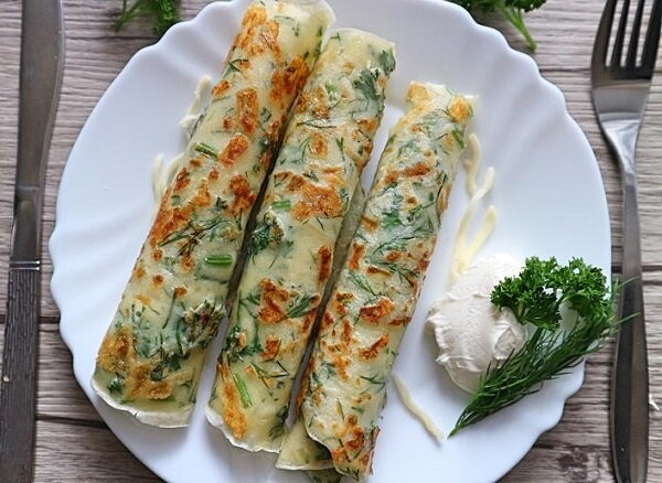Блины с сыром и зеленью – рецепт, состоящий из обычного теста для блинов с добавлением измельченного укропа и тертого сыра. Это не только вкусное, ароматное и необычное блюдо, но и полезная еда, которая подходит для завтрака, ужина или обеда. Приготовление блинов с зеленью похоже на готовку блинов с припеком, очень простое, им можно заняться утром перед работой, а можно развести тесто вечером накануне, чтобы на утро осталось только быстро поджарить эти чудесные румяные блинчики с зеленью. Для этого рецепта подойдет любая зелень, которую вы любите. Для меня лучшим является укроп, но можно использовать петрушку, базилик, шпинат, эстрагон – любую молодую зелень, аромат которой вам нравится. Точно так же можно выбрать сыр по вкусу. Я люблю моцареллу, так как она мягкая и быстро плавится, но можно добавить любой тертый сыр или даже творог – блины получатся неизменно вкусными. Ингредиенты: 150 г сыра; Приготовление: Влейте в миску молоко, разбейте яйца, добавьте сахар и соль, а затем все хор