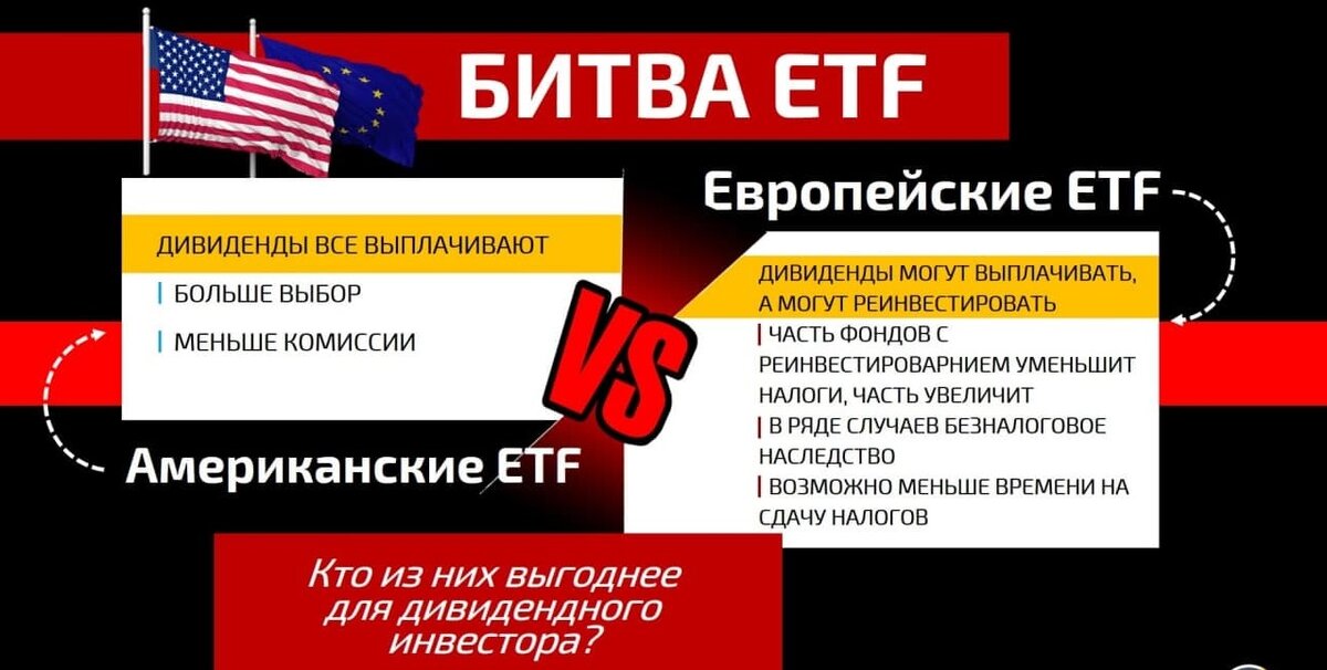 Когда вы владеете ETF фондом, именно он получает за вас дивиденды от компаний, а потом он уже решает, что с ними делать: передать вам или распорядиться иначе. Бытует мнение, что для инвестора на этапе накопления, то есть для того, кому не нужны сейчас дивиденды, выгоднее инвестировать в европейские ETF фонды. Они не передают деньги акционерам, а самостоятельно докупают на пришедшие от компаний выплаты ещё акций. Получается своего рода внутреннее реинвестирование дивидендов. Если бы деньги дошли до инвестора, он мог бы сам купить на них нужные позиции, но при поступлении денег на брокерский счёт с них будут удержаны налоги. Европейские фонды позволяют это обойти. На самом деле ответ здесь не будет однозначным, давайте посмотрим на ситуацию более полно: В США, по закону, все ETF должны передавать доходы , полученные от активов, будь то дивиденды от акций или купоны от облигаций , в виде собственных дивидендов владельцам акций фонда. В Европе тоже есть ETF, которые выплачивают диви