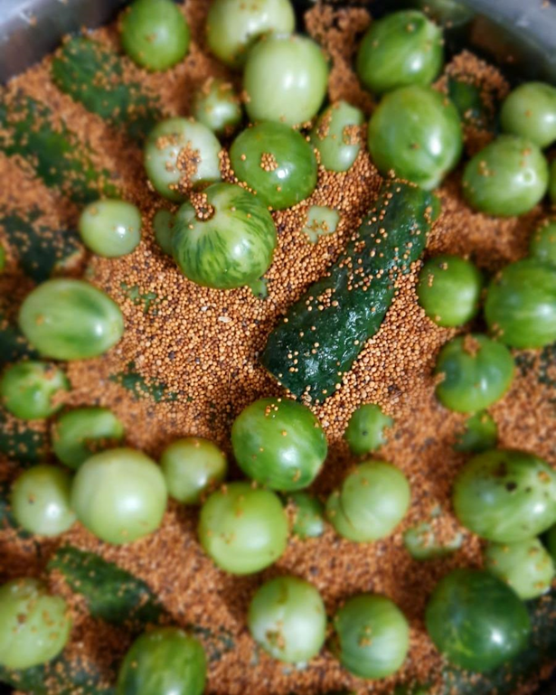 Фирменный рецепт Чабан В.С. Дважды два Четыре. Ингредиенты · Помидоры зеленые — 8 кг · Огурцы — 4 кг · Зелень (корень и листья хрена, корень имбиря, семена горчицы, киндза, реган, тархун, мята, листья смородины, вишни и всё чего хочется) —400 гр. · Болгарский перец — 8 шт. · Перец острый — 4 шт. · Чеснок — 4 шт. очищенный и 8 шт. неочищенный.. · Соль — 400 гр. · Сахар— 800 гр. · Вода — 8 л. Я не писал статьи на кулинарные темы, но многие друзья попросили этот рецепт, и я с удовольствием делюсь им с Вами. Почему озаглавил статью Золотое Сечение, там конечно главный коэффициент не 2, но я решил, мы же с Вами не пирамиды строим. Сначала на дно 30 литровой кастрюли (в моём случае 20 литровая, поэтому всё впритык) кладём чеснок не очищенный 4 шт. 8 четвертинок болгарского перца, немного зелени, чеснока и острого перца. Засыпаем частью соли и сахара. Затем укладываем самые крупные помидоры. Теперь этот слой укладывается зеленью перцем и чесноком посыпается частью соли и сахара. И сверху
