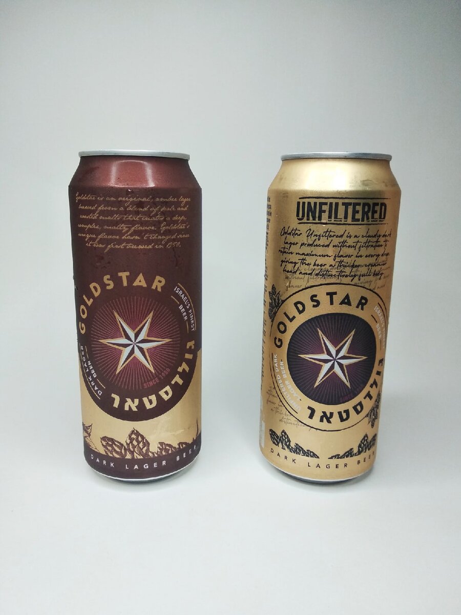 Приветствую вас уважаемые друзья. В всеми любимое "Красное и белое" завезли новое пиво прямиком из Израиля под названием "Goldstar". Продается оно там в двух видах: темное фильтрованное и темное нефильтрованное. Честно сказать пиво из Израиля вижу впервые, поэтому стало интересно попробовать его и поделиться своими впечатлениями с вами. Цена за 0,5 составила 89 рублей. Ценник очень даже не маленький, поэтому ожидания от этого пива будут соответствующие. Хотя не забываем про то, что пиво варится не на территории РФ. Все издержки на перевозку заложены в цене. Дизайн банок достаточно нейтральный. Итак, преступим к дегустации.
