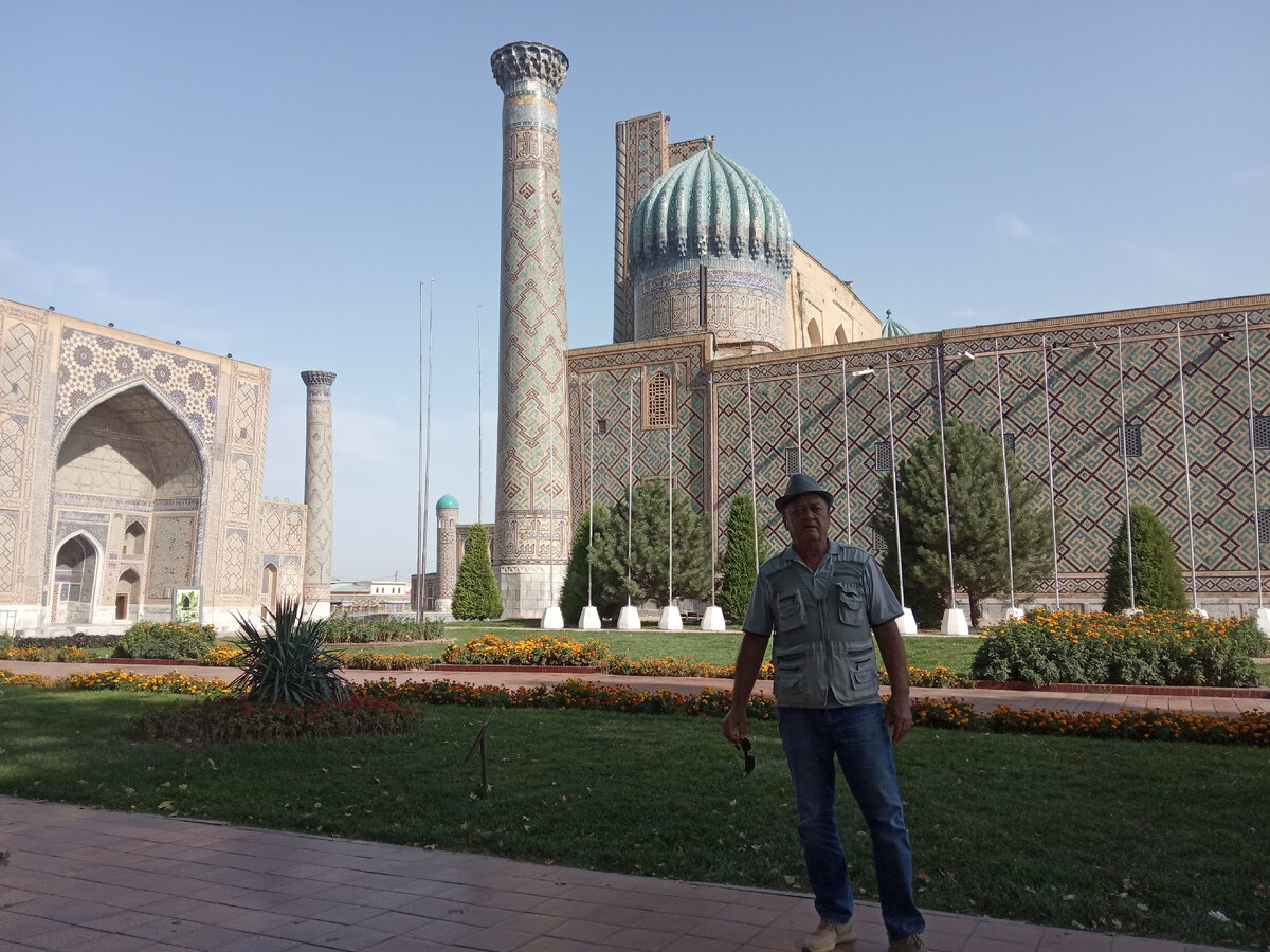 От обсерватории Улугбека мы вернулись почти обратно, в точку, откуда началась наша прогулка по городу. На площади Регистан мы были поздней ночью и ранним утром. Тогда она была пуста, днем же площадь между тремя медресе была полна людей. Скверик рядом тоже был многолюден. С трудом отыскав свободную лавочку, мы вытянули натруженные ноги. Идти больше ни куда не хотелось. Мы и так были были переполнены впечатлениями. Рядом была группа местных туристов, наверное от какой-то организации. Вообще таких групп было очень много и молодежь и пожилые. Была и какая-то новая школа, все в одинаковых футболках и со своим знаменем. Что-то современное, но флаг мне не понравился, он был черным, с надписью на английском. Мы еще в мавзолее Ходжи Даниера, ждали пока эта школа освободит территорию. Толкаться в такой толпе не хотелось. Их было больше сотни, различного возраста. Жена мой общительная, сразу завела разговор с женщинами на соседней лавочке, пожаловалась, что с нас, как иностранцев, требуют повыш