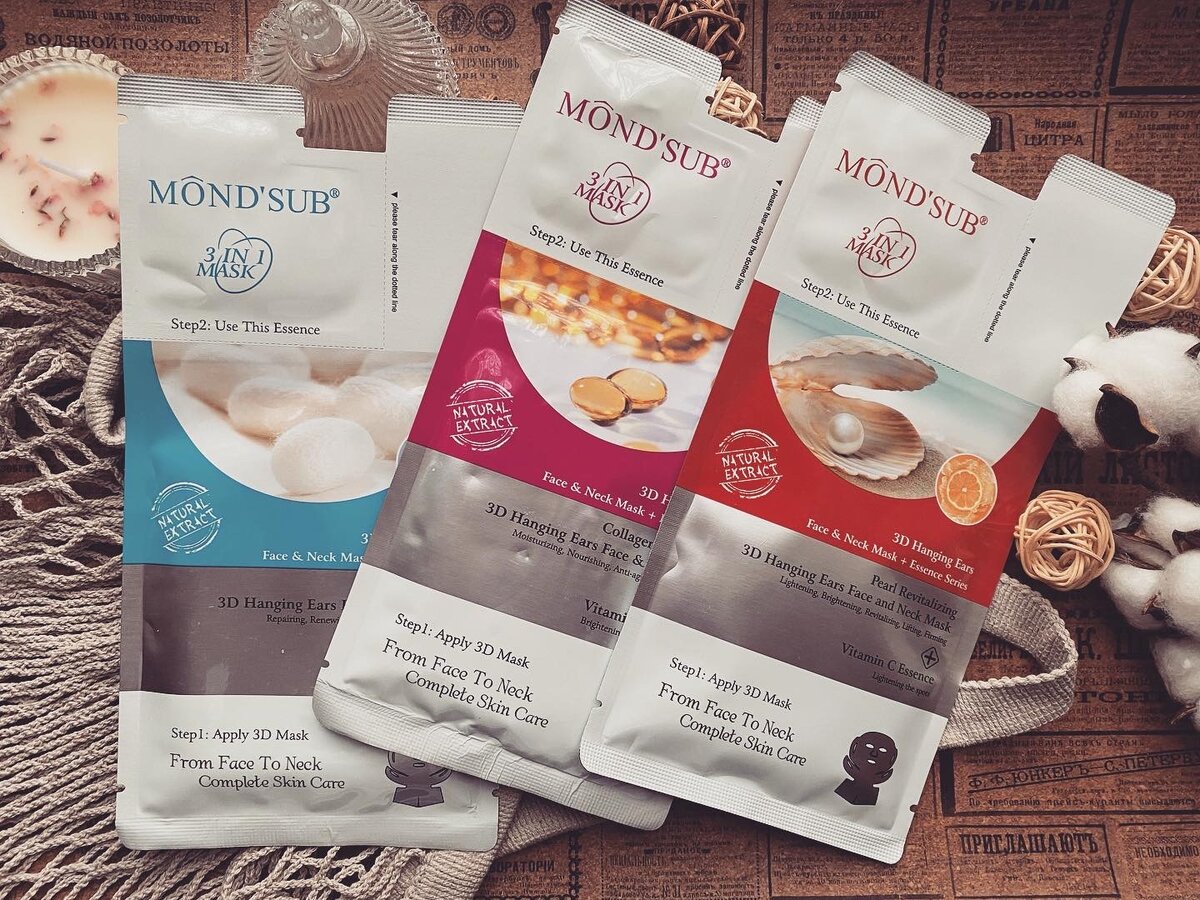 Индустрия красоты не стоит на месте, всегда ищут новое и новые решения! Производство тканевых масок Mond Sub также не стоит на месте и разрабатывает новые лекало и подход к уходу! Восстанавливающая жемчужная 3D маска MOND SUB для лица, шеи и области вокруг ушей + Эссенция с витамином С Питательная и восстанавливающая 3D маска MOND SUB для лица, шеи и области вокруг ушей с протеинами шёлка Омолаживающая 3D маска MOND SUB для лица, шеи и области вокруг ушей с коллагеном + Эссенция с плацентой - сашетка с двумя отсеками, с самой тканевой маской и эссенцией, с приятными ароматами - у маски оказалось специфичное лекало, немного непонятное мне, но продуманное, есть петли для ушей, тканевая маска для шеи, с перфорацией, если не нужна можно отсоединить или использовать раздельно - хорошо увлажняет кожу лица, не смотря на своё лекало, все необходимое передаётся на кожу лица - завершает уход эссенция, приятная, быстро впитывается и не оставляет ощущения липкости - в сочетании с эссенцией дан