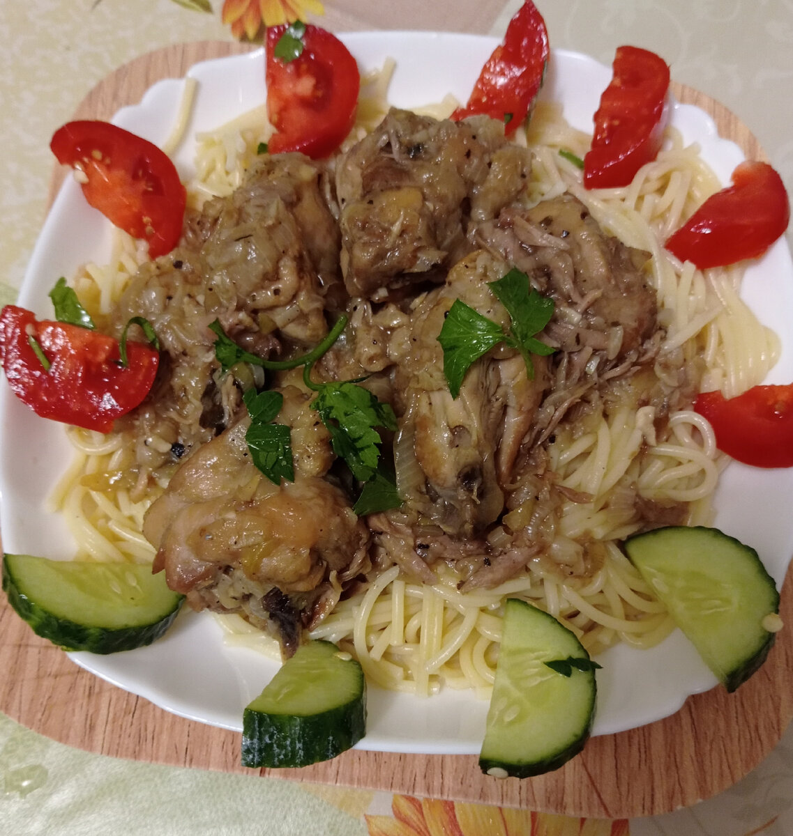 Доброго времени суток, дорогие читатели и гости моего канала. Если вы случайно обнаружили в холодильнике пару окорочков и не знаете, что с ними делать, я вам подкину идейку вкусного и сытного обеда. У меня три небольших куриных окорочка. Их надо помыть, проверить, все ли нам нравится в их внешнем виде. Что не нравится, удаляем. Разрезаем окорочок на средние кусочки. Ничем его не натираем, не маринуем. Это будут натуральные кусочки мяса с косточками. Сковороду, нашу любимую, разогреваем, наливаем либо масло растительное, либо смалец. У меня свиной смалец. И опускаем в неё кусочки курицы. Когда хорошо они поджарятся, убираем в тарелку. И на том же жиру жарим крупно порезанный лук. Затем все соединяем и тушим вместе до готовности. На этом этапе надо посолить, поперчить, добавить лавровый лист и немного кипяченой воды. Добавляю пару зубчиков чеснока. Накрываю крышкой и на медленном огне тушу до готовности. Вот и весь процесс. Все очень просто и быстро. Варим к мясу спагетти.