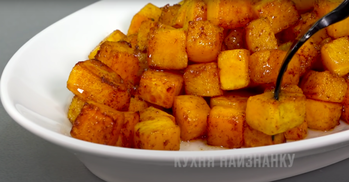 И мы едим, и детям нравится. Готовится такой десерт очень быстро и просто. И на завтрак к чаю, и просто так, вместо конфет. Любой сорт тыквы подойдет. Всегда получается вкусно! В видео ниже я показала этот рецепт и еще 6 очень интересных и простых рецептов с тыквой. Посмотрите - вам понравится, обещаю: КАК ГОТОВИТЬ: Тыкву заранее нарезаю на небольшие кусочки. Любые. Можно соломкой, например, брусочками или кубиками. Я обычно кубиками нарезаю. На сковороде растапливаю кусочек сливочного масла. Выкладываю нарезанную тыкву. Перемешиваю и готовлю до мягкости. Время зависит от сорта тыквы и от того, как тыква нарезана. Мне сегодня понадобилось около 10 минут. Обязательно добавляю к тыкве щепотку соли. А когда тыква уже практически готова, посыпаю ее молотой корицей. Если она попадается недостаточно сладкая, можно добавить сахар. Вместо корицы сюда также подойдет кардамон или цедра лимона. Но именно с корицей нам нравится больше всего. Снова перемешиваю и готовлю еще пару минут. Затем выкла