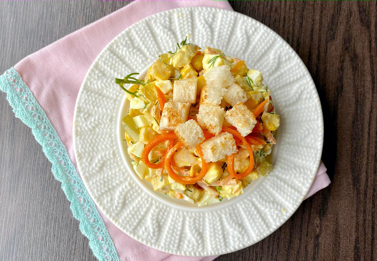 Здравствуйте, дорогие читатели! Вчера захотелось сделать салат — не слишком сложный и из того, что есть под рукой. У меня часто так бывает: открываю холодильник и начинаю придумывать, что можно приготовить из имеющихся продуктов. Раньше я уже делала похожий салат, но с крабовыми палочками. На этот раз они не понадобились — захотелось чего-то другого. Выбрала курицу, ведь вся семья ест ее с удовольствием. Получилось вкусно и очень удобно — никаких лишних хлопот. Долго не жарьте, будет сухая грудка и не вкусная. Все, салат готов. Карри придал салату приятный вкус и очень аппетитный аромат, попробуйте, может и вам понравится. СОСТАВ САЛАТА: Филе куриное - 250 г Морковь по-корейски - 150 г Яйца - 2 шт. Кукуруза консервированная - 150 г Майонез - по вкусу Зелень - по вкусу Соль - по вкусу Друзья, если вам понравился рецепт, то поставьте лайк 👍 и подпишитесь. Буду благодарна🤗! 👉 Мой youtube-канал 👉 Группа в ВК 👉 Аймкук 👉 Telegram ВСЕГО ДОБРОГО И БУДЬТЕ ЗДОРОВЫ! #салат #домохозяйка со
