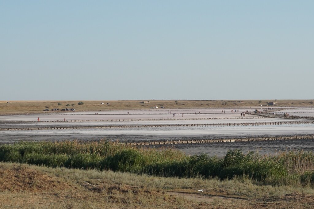 Одна из природных достопримечательностей Арабатской стрелки - Розовое озеро. В общем-то надо обладать изрядной фантазией, чтобы на моей фотографии увидать в слое солёной грязи розовый цвет. По-моему, название озера определяется ещё и тем, что добытая на некоторых его участках соль имеет достаточно ярко выраженный розовый оттенок. Да и вода, если хранить её в стеклянной посуде, розовый цвет не теряет довольно долгое время. Виновниками необычного цвета являются микроскопические водоросли, способные жить в очень солёной воде. Грязь чёрная, соль да вода розовые являются сейчас неплохим дополнительным заработком для жителей села Приозерное, ведь в пляжный сезон сюда приезжает достаточно много туристов. Да и весной - осенью во время туров выходного дня редко кто уедет с озера без соли, воды или грязи. Цена-то не кусачая. А добывать их самим долго и не очень-то легко. Давным-давно, лет 100 назад в озере в промышленных масштабах добывалась соль, даже сегодня в просоленной грязи сохранились де